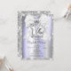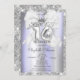 Silver glitter tiara, and white bow on a violet and silver glitter Sweet 16 birthday party invitation.