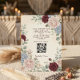 Set a sophisticated tone for your romantic celebration with this deep red floral design featuring modern scannable technology for seamless guest details.This layout utilizes a highly structured, centralized composition framed by a rich palette of deep crimson and dark red botanical illustrations. The visual hierarchy pairs traditional serif text with flowing calligraphy accents, intentionally drawing the eye toward a functional, high-contrast black-and-white scannable square at the base for digital routing. The background remains a soft, muted cream to ensure maximum legibility for older guests and screen readers.This is a flat printed image with a watercolor illustration effect, not actual raised material.