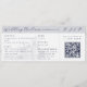 This wedding invitation is designed to look like a plane ticket. It features a semi-opaque illustration of a castle, which you can replace with an image of the destination wedding venue. Elegant dark blue lettering in serif and script fonts lay out the bride and groom names, and details of the wedding, including the location, date, and a QR code to RSVP.