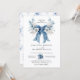 Timeless dusty blue wedding invitation with a romantic oversized bow, delicate watercolor florals in soft blues/whites, and elegant white rose accents. Classic calligraphy layout for easy personalization of names, date, time, venue & RSVP. Perfect "something blue" for sophisticated, romantic weddings — airy, luxurious, and fully customizable! 💙🤍