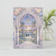 This refined wedding composition features a symmetrical garden arch framed with watercolor roses, hydrangeas, and cascading wisteria vines in soft lilac, blush pink, peach, dusty blue, and gentle greenery. A softly illuminated pathway and hanging lantern lights guide the eye toward the central arch beneath a deep twilight night sky, while Arabic Bismillah calligraphy appears above a structured typography layout combining decorative serif headings with flowing vintage script accents. Ornamental floral and geometric borders reflect classic Islamic and South Asian wedding stationery traditions commonly seen in Nikah ceremony designs.This is a flat printed image with a faux gold foil effect, not actual raised material.