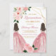 Celebrate a milestone in style with this elegant floral Quinceañera invitation. Featuring pink roses, lush greenery, and gold geometric accents, this design beautifully highlights the sophistication of the occasion. The charming illustration of two girls in pink ball gowns adds a festive and personal touch, making it perfect for honoring a special young lady. Ideal for family gatherings and formal celebrations, this invitation sets the tone for an unforgettable evening.