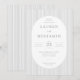 This elegant wedding invitation features a clean, minimalist design with vertical striped borders framing an oval-shaped central area. The color palette consists of soft gray tones that create a sophisticated and understated look, perfect for a formal event. Classic serif typography is used throughout, emphasizing the couple's names and event details in a timeless style. The layout is balanced and structured, ensuring clarity and readability while conveying a mood of elegance and simplicity. Ideal for couples seeking a refined and modern aesthetic for their special day.