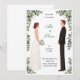 Featuring a beautifully hand-drawn bride and groom surrounded by soft green foliage, this design blends modern minimalism with natural romance.