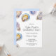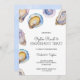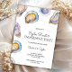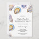 Invitation card for an oyster roast and engagement toast with watercolor oyster shells on a marble background. Names and event details are elegantly printed.
