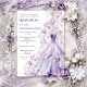 This elegant quinceañera invitation features a soft, romantic design in shades of lavender and blush. A stunning lilac ball gown with delicate sparkle details cascades down the right side, its flowing layers glowing with subtle shimmer for a fairytale effect. Surrounding the gown is a lush arrangement of pastel peonies and soft greenery, creating a dreamy botanical frame. The typography blends graceful script and classic serif fonts in coordinating purple tones, giving the layout a refined and formal feel. Set against a clean ivory background, the overall design is feminine, sophisticated, and perfect for a traditional yet modern quinceañera celebration.