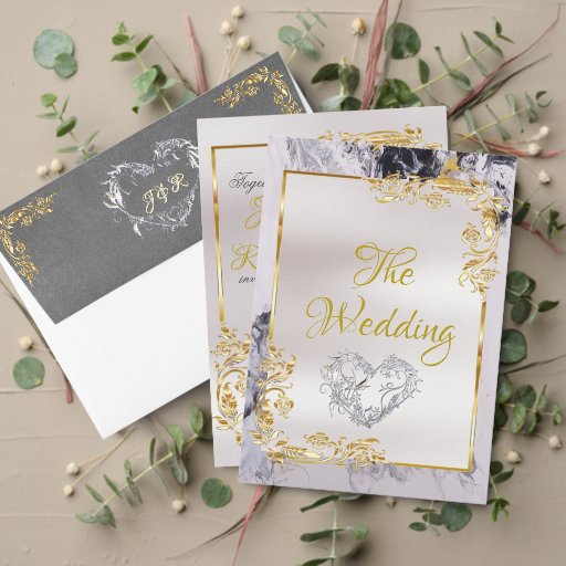Invitación Elegant Marble, Grey, Gold Frame, Gold Heart