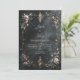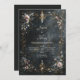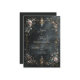 Transport your guests to a romantic evening under the stars with this enchanting design. The background features a deep navy and black texture reminiscent of a midnight sky, dusted with subtle golden speckles that mimic starlight. Framing the text is a sophisticated structure of thin gold geometric lines, adorned with soft pink cosmos flowers and silvery-blue sage leaves. The design is anchored at the top and bottom by ornate jeweled crests, adding a regal finish to this moody, celestial-inspired masterpiece. This dreamy artwork is an impeccable choice for an evening garden wedding, a "starry night" themed prom, or a sophisticated winter formal. You might also select this design for a twilight bridal shower or a romantic engagement dinner held under the moonlight. It is also perfectly suitable for New Year's Eve party flyers, corporate gala dinner menus, or luxury jewelry store grand opening invitations.