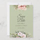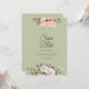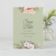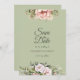 Elegant save the date card featuring soft blush peonies and greenery on a muted sage green background. Perfect for a romantic garden or spring weddings. Personalize with your names and date for a timeless, elegant announcement.