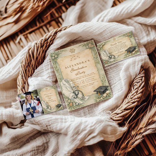 Celebrate years of dedication, late nights, and a deep love for animals with this elegant veterinary graduation design. Featuring soft botanical accents, a classic white coat illustration, and refined academic details, this invitation is perfect for honoring a new veterinarian’s milestone achievement. Ideal for veterinary school graduation parties, white coat celebrations, or professional graduation gatherings, this timeless design is fully customizable to match your event details.