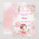 Invite your guests to celebrate your little one's birthday in enchanting style with this unique ballerina-themed birthday invitation. Featuring a delicate watercolor art design, it depicts a graceful ballerina dancing amidst soft pink flowers and heart-shaped balloons, adding a touch of elegance and joy to your special occasion.