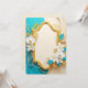 "Stunning elegant design featuring a luxurious ornate gold frame centered on a sophisticated split background of vibrant turquoise and soft cream waves. Beautiful white orchids with delicate yellow centers bloom alongside shimmering gold palm leaves, teal foliage, and cascading pearl and gold bead strands with sparkling highlights.
