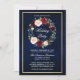 Elegante acuarela de fondo azul con acuarela Borgoña Marsala floral Invitación de fiesta navideña. Incluye hermosos rosas y vegetación botánica. Marco dorado.