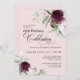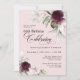 Celebra un cumpleaños especial con esta hermosa invitación de cumpleaños número 60. Presenta elegantes bordes florales en rosas borgoñas y rosas rosas a cada lado del texto elegantemente colocado. Los colores son rosa pálido, rojo burdeos profundo y ciruela mezclada con vegetación etérea y flores de acento blanco diminutas en un fondo rosa femenino. Personalice la plantilla de texto con su información. Puede editar la edad a cualquier cumpleaños de edad.