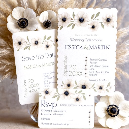 Un diseño boda atemporal con delicadas flores anémonas de marfil con centros marinos profundos, bordes de vieiras y un suave fondo texturado. Perfecto para celebraciones románticas y elegantes.