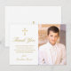 Envía una tarjeta de agradecimiento personalizada con foto simple pero elegante a familiares y amigos por asistir a tu primera comunión. Este diseño presenta una foto a la derecha para cambiar fácilmente a la tuya y a la izquierda hay una simple cruz cristiana dorada falsa con tu mensaje de agradecimiento en estilo clásico con letra dorada falsa. Personaliza el mensaje de agradecimiento con el tuyo o utilízalo tal cual. La parte posterior de la tarjeta tiene una cruz dorada falsa coincidente sobre blanco. Esta fue una alegría diseñar. Espero que disfrutes. Diseñado por Susan Coffey.