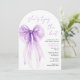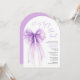 Invitación elegante con forma de arco para despedida de soltera que presenta un lazo coqueto de acuarela morada, 'ella está atando el nudo' destacado en una elegante letra de caligrafía morada, y el nombre de la novia y los detalles de la despedida en letra simple.