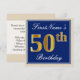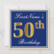 Este sencillo y elegante diseño de invitación para fiestas de cumpleaños incluye un mensaje personalizado como "50 cumpleaños de FirstName" (con el "50" con un aspecto de color falso/imitación de oro) dentro de un área cuadrada de color azul con un sencillo contorno de borde. El nombre se encuentra en un texto elegante de color blanco tipo script, y se puede personalizar. En la parte posterior se incluyen detalles de invitación personalizados. Una invitación para una fiesta de cumpleaños como esta podría ser usada tal vez cuando se invita a la gente a una fiesta de cumpleaños que se lleva a cabo para alguien que está celebrando su quincuagésimo cumpleaños. [~Z0000228]