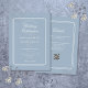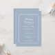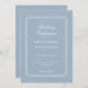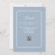Las líneas geométricas elegantes enmarcan la información personalizada de los bodas en la tipografía de moda sobre un polvoriento fondo azul. Con sus detalles y el código QR del sitio web boda al revés. Diseñado por Thisisnotme©