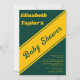 Esta elegante invitación de Baby Shower en color verde y dorado es perfecta para una Baby Shower moderna. el diseño sencillo incluye una elegante caligrafía dorada sobre un fondo verde.