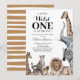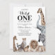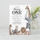 Invitaciones modernas para baby shower de wild one con un fondo blanco liso simple, elegantes animales de safari en acuarela (jirafa, elefante, león, cebra, leopardo, mono, abejero) y una plantilla de fiesta de baby shower fácil de personalizar.