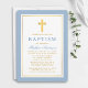 Elegante Invitación al Bautismo Azul claro y Oro con Cruz.