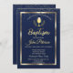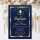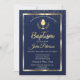 Elegante marco dorado y confeti sobre fondo azul marino.