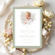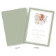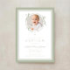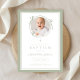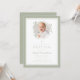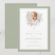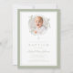 Elegante invitación de bautizo con lazo verde salvia. Para mejores resultados, sube una imagen cuadrada del bebé.