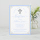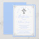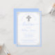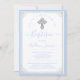 Elegantes invitaciones de bautizo azul bebé y plata con hermosa cruz plateada en un fondo de borde azul bebé y plata. Esta invitación de bautizo de niño se personaliza fácilmente para su evento agregando sus datos. También puede cambiar el color azul al que prefiera. Puede eliminar la perla azul de la cruz si lo prefiere.