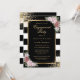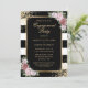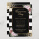 Elegante invitación a la fiesta de compromiso a rayas blancas y negras con flores rosa rubor enmarcando los detalles del evento dentro de un marco dorado adornado con confeti dorado. Elementos coincidentes disponibles. Invitación a la fiesta de compromiso floral de Rubor. Invitación a la fiesta de compromiso en negro y oro.