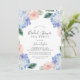 Esta elegante invitación a una fiesta de té con ducha de novia hidrangea azul es perfecta para un evento de primavera o verano. El diseño floral clásico presenta hidrangeas de color azul en polvo suave acentuadas con flores rosas neutras y hojas verdes.