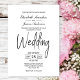 Una elegante invitación minimalista de boda blanca con texto negro.