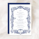 Elegante tarjeta de invitación a la boda de marco azul de la Marina floral barroca vintage