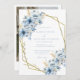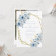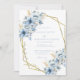 Haga una impresionante primera impresión con esta elegante invitación a bodas con marco geométrico floral azul. Con una sofisticada mezcla de flores polvorientas azules y navales, este diseño está enmarcado en un moderno borde geométrico de oro, añadiendo un toque de elegancia y romanticismo.