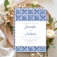 Elegante invitación a la boda de azulejos azules mediterráneos.