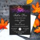 Esta elegante invitación a la boda de otoño es perfecta para un boda moderno de otoño. El diseño es sencillo, con ramas luminosas y hojas con tipografía blanca elegante sobre un fondo negro