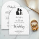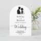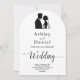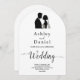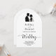 Esta elegante invitación a la boda en arco blanco y negro es perfecta para un boda moderno. El diseño es sencillo y cuenta con una elegante caligrafía negra y un ilustracion de novios sobre un fondo blanco y limpio. La tarjeta de invitación incluye los detalles del boda en la parte posterior en lugar de pagar por una tarjeta separada.