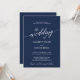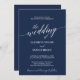 Esta elegante tarjeta de invitación a la boda con caligrafía marina es perfecta para una boda en otoño. El diseño es sencillo, con una tipografía romántica y caprichosa sobre un fondo azul marino. Para más opciones de redacción de la invitación a la boda, consulte la elegante y completa colección de bodas de caligrafía: https://www.zazzle.com/collections/119271177614507407