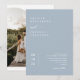 Esta invitación presenta una caligrafía elegante y una tipografía simple sans serif en un fondo azul polvoriento con una foto en forma de arco y código QR. La sencillez y el diseño limpio de esta invitación funcionan bien con todos los temas bodas y sin duda una gran adición a su boda. Simplemente personalizar los nombres y la redacción en unos pocos pasos fáciles y personaliza la tarjeta de invitación con tu foto de la pareja feliz y reemplaza el código QR con el tuyo al fondo de la invitación para darle un agradable toque personal. Nota: La elegante caligrafía del texto "y", tanto en la parte delantera como en la parte trasera de la tarjeta, así como la expresión "recepción a seguir", obras de arte gráficas y otros elementos gráficos, no pueden editarse, eliminarse ni moverse. Están arreglados. Si necesita cambiar el color, puede personalizar la tarjeta de invitación. Puede personalizar y personalizar la invitación para que se ajuste a sus necesidades de eventos de boda y simplemente haga clic en el personalizar de la invitación. Puede personalizar fácilmente esta invitación con su propio texto y compartirla con sus invitados digitalmente, ya sea a través de texto, correo electrónico o medios sociales. Si lo prefiere, también puede enviar una versión impresa por correo a sus huéspedes. O, puede hacer ambas cosas: enviar una versión digital y hacer un seguimiento con una copia impresa para un toque personal.