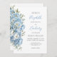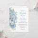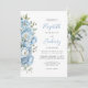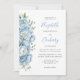 El borde izquierdo de esta elegante invitación a la boda incluye un ramo floral de color azul pastel con acuarela. El texto del personalizable combina el guión de escritura a mano azul con el copperplate gris de carbón y las fuentes cursivas en un fondo blanco. El diseño floral se repite al revés.