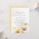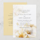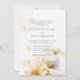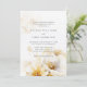Elegante y romántico acuarela gran ramo de flores blancas amarillas y doradas al final de la invitación a la boda y flores pequeñas tintadas encima con detalles bodas en la espalda.