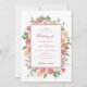 Invitación a la boda con fondo floral de manantial suave sobre las flores hay una caja de texto blanca con dos bordes finos.
