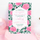 Un jardín de amor. El diseño es elegante, con un patrón de flores de peón rosado y una caligrafía de moda sobre fondo blanco. Este diseño es perfecto para su boda floral sencillo y elegante. El texto puede ser fácilmente personalizado para un diseño único y de tipo para su día especial.