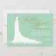 Elegante invitación a la ducha de novia para el elegante noviazgo incluye un adorno con letra de guión de caligrafía y un vestido de boda. Los detalles del desplazamiento florecen, flor y mariposa acentúan el vestido etéreo. Blanco, verde menta y colores dorados antiguos.