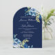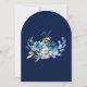 Elegantes rosas azules y blancas decoran esta bella invitación a la boda floral en arco de la noche. El marco de Relieve metalizado de moda de imitación dorada se acentúa con flores color bonito índigo y un bonito estribo botánico amarillo claro. Los nombres de la pareja están escritos en el clásico guión cursivo blanco en esta invitación de invierno moderna.