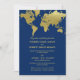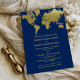 Las elegantes invitaciones de bodas inspiradas en viajes vintage presentan un diseño de borde de mapas del mundo. Color azul marino y Relieve metalizado falso dorado.