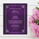 Se trata de una elegante y rica invitación de boda para cualquier temporada. Un marco de plata geométrica de esquina y de diseño elegante encierra el texto de tu boda, que también es de plata. Las imágenes y el texto se colocan sobre un fondo de gradiente púrpura real que casi brilla! El fondo de la invitación tiene el mismo fondo morado. ¡Muy elegante!