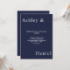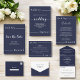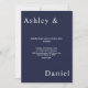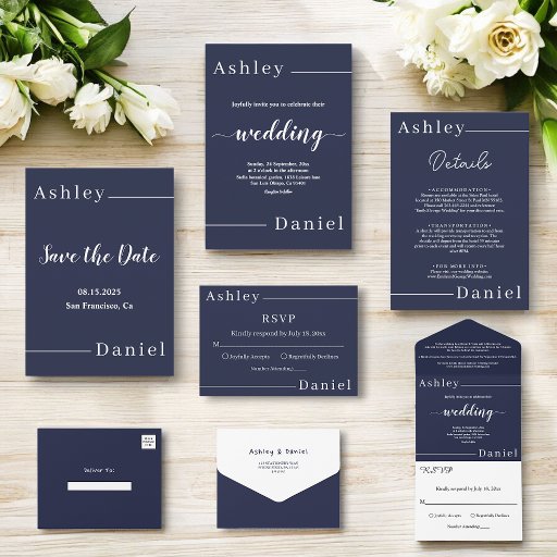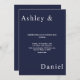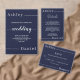 Esta elegante invitación a la boda azul marino es perfecta para un boda moderno. el diseño es sencillo, con una elegante caligrafía blanca sobre un fondo azul.