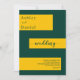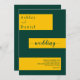 Esta elegante invitación a celebrar bodas de oro y verde es perfecta para un boda moderno. el diseño es sencillo, con una elegante caligrafía verde sobre rayas doradas sobre un fondo verde.