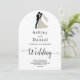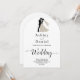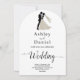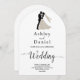 Esta elegante invitación a la boda en arco blanco y negro es perfecta para un boda moderno. El diseño es sencillo y cuenta con una elegante caligrafía negra y un ilustracion de novios sobre un fondo blanco y limpio. La tarjeta de invitación incluye los detalles del boda en la parte posterior en lugar de pagar por una tarjeta separada.
